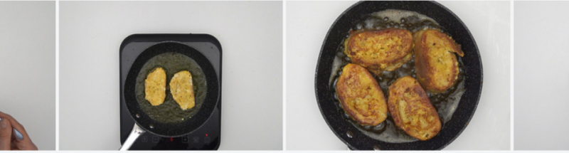 - Wir braten den French Toast von allen beiden Seiten goldbraun an. Wir benutzen eine Gabel, um den French Toast zu umrunden.