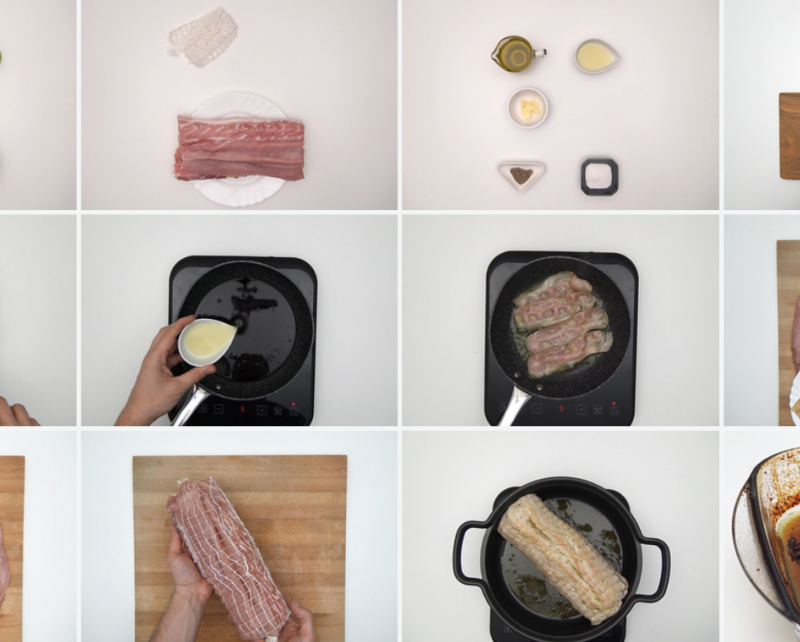 - Wir reihen uns weiter aneinander, bis die Speckscheiben vollständig bedeckt sind oder bis die Mitte des Schweinefleischstücks gut gefüllt ist.