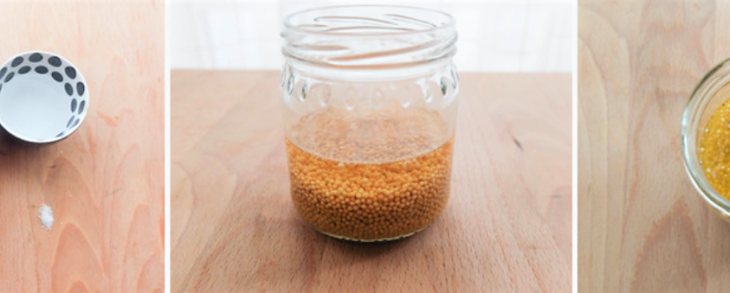 - Wir geben die Senfkörner in eine Schüssel und bedecken sie mit Essig und 100 ml. Wasser für 12 Stunden.