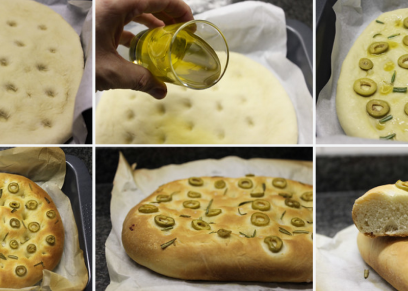 - Die Teigoberfläche mit Olivenöl bestreuen, die in Scheiben geschnittenen Oliven und die Rosmarinblätter darauf legen. Noch 30 Minuten ruhen lassen.