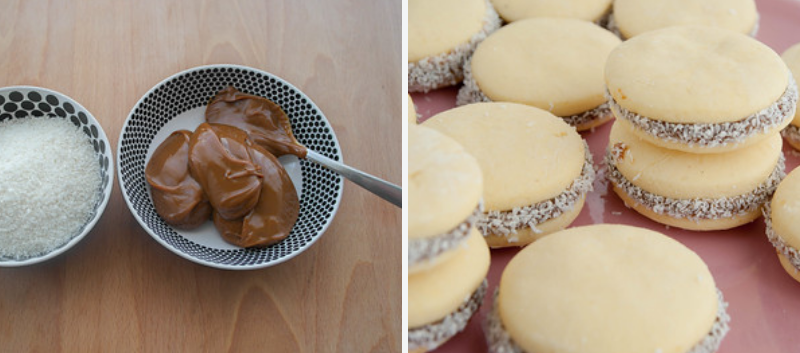 - Sobald die Tapas unserer Alfajores kalt sind, füllen wir sie mit einem Esslöffel Dulce de Leche. Zum Schluss (optional) bestreichen wir die Seiten nach Belieben mit Kokosraspeln.