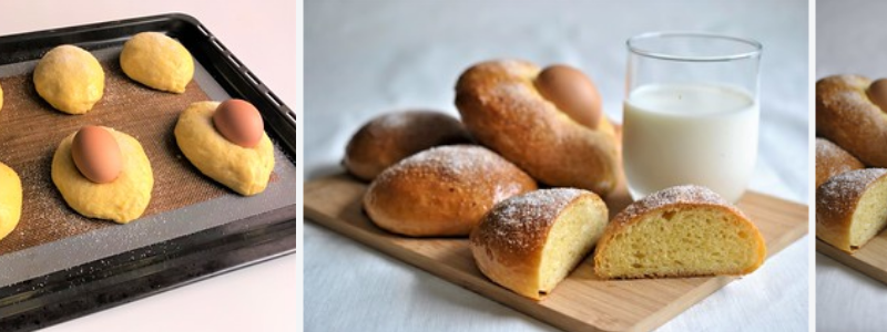 - Wenn die Affen fertig sind, bemalen wir sie erneut mit Milch oder einer Mischung aus Milch und Eigelb, bestreuen sie mit Zucker und legen hartgekochte Eier in die Mitte der Oberfläche. Wir können sie auch ohne Eier backen.