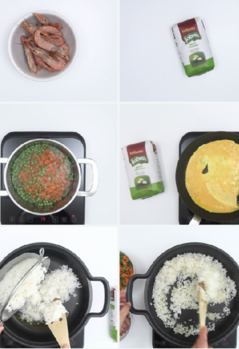 - Wenn der Reis ungefähr 5 Minuten entfernt ist, legen wir ihn mit dem Rest des Tellers zusammen.
