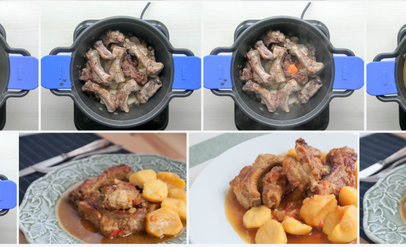 Obwohl Schweinerippchen nicht als Teil des Schweinefleischs mit übermäßiger Qualität angesehen werden, kombiniert mit Gemüse und dieser Art der Kartoffelzubereitung, machen sie sie zu einem sehr leckeren Rezept, das andere aufwändigere und weniger wirtschaftliche Eintöpfe in keiner Weise beeinträchtigt.