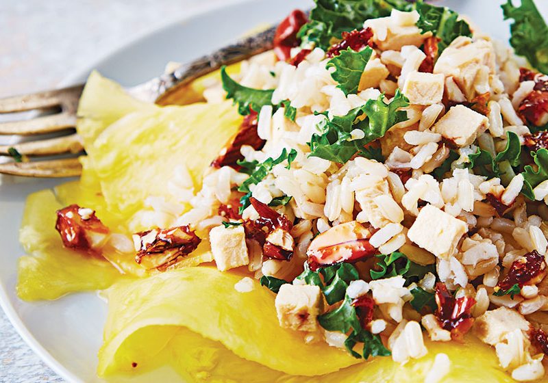 - Kombinieren Sie braunen Reis mit Hühnchen, Grünkohl, Zwiebeln und Walnüssen in einer Schüssel. Fügen Sie das Olivenöl, den Kreuzkümmel und den Zitronensaft hinzu; Salz Pfeffer.