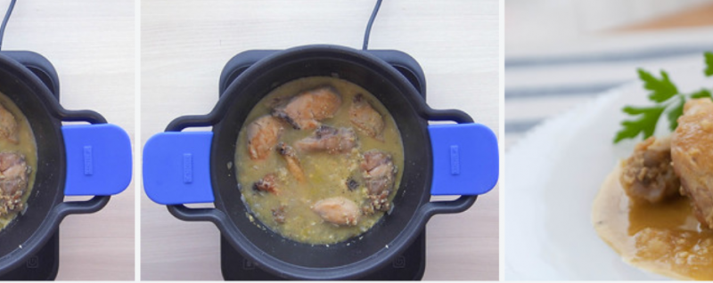 Kochen und Abschlusspräsentation des Huhns in Pepitoria